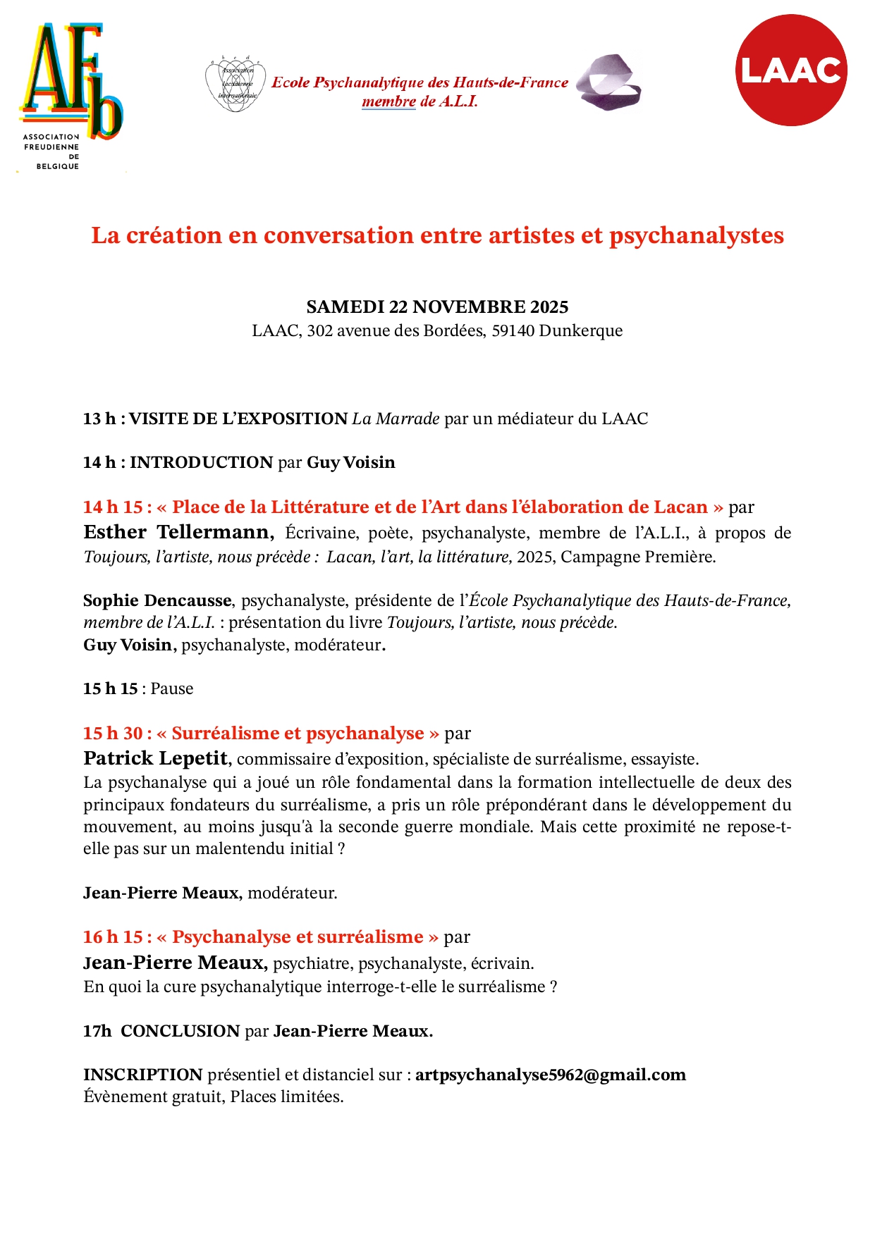 Modalité d'inscription : INSCRIPTION présentiel et distanciel sur : artpsychanalyse5962@gmail.com Évènement gratuit, Places limitées.