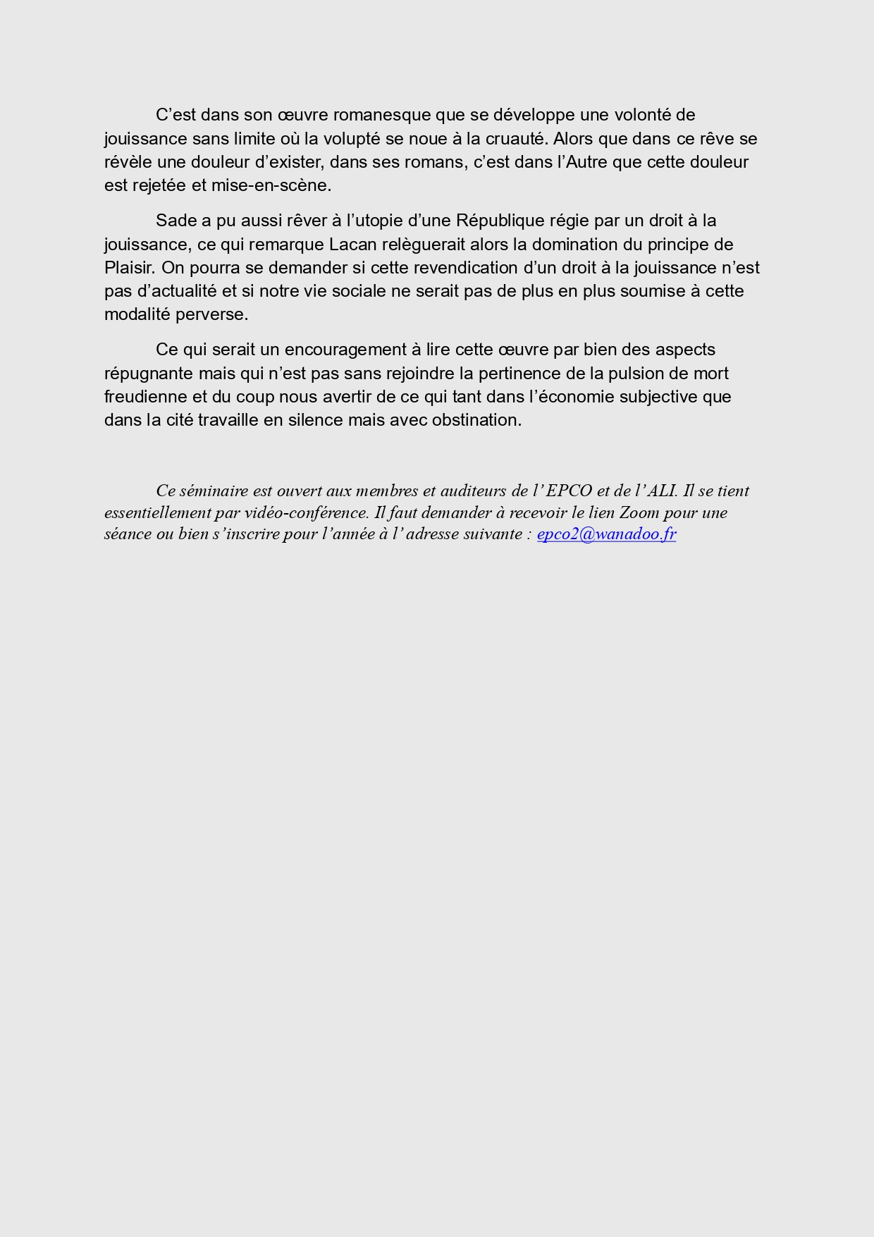 Modalité d'inscription : Ce séminaire est ouvert aux membres et auditeurs de l’ EPCO et de l’ ALI. Il se tiendra in situ et par vidéo-conférence. Si ce n’est pas déjà fait, Il faut demander à recevoir le lien Zoom pour cette séance à l’adresse suivante : epco2@wanadoo.fr